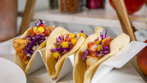 Grilled shrimp tacos with a salsa of fresh mango, avocado, red onion, jalapeño, and lime juice.